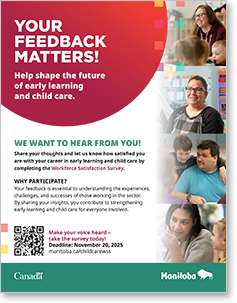 Whether you are currently working in a licensed early learning and child care centre, nursery school or home, or have left the sector, your feedback is essential in understanding the experiences of individuals working in Manitoba’s early learning and child care sector. The input you provide will contribute to strengthening early learning and child care in Manitoba.