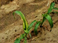 After a period of rapid seedling growth some plants may be observed to be lying on their side, with poor brace-root development, anchored only by the mesocotyl.