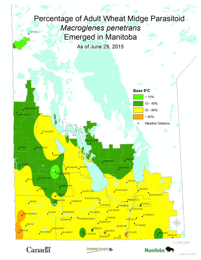 Wheat Midge Emergence: Emergence of wheat midge, based on degree-day models, is currently less than 10%. So most of the emergence is yet to come and will likely happen in the second and third week in July. So any wheat that is already producing anthers, or heading out and close to producing anthers, should be at low risk of wheat midge damage. After the wheat heads produce anthers the wheat kernels are no longer susceptible to feeding by wheat midge. Note from the maps below that although wheat midge emergence is still less than 10%, its key parasitoid, Macroglenes penetrans, is further ahead in its emergence, so populations will be ready for wheat midge when it emerges.