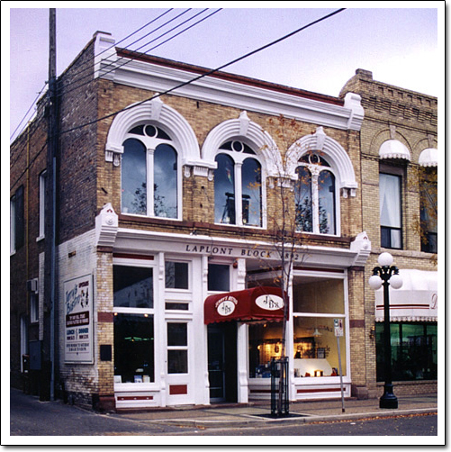 The two-storey LaPlont Block was designed in the Romanesque Revival style of architecture. That popular style was characterized by round arched openings, towers, decorative brick and rusticated stone finishes. The block’s brick façade is highlighted with heavy stone arches on the second floor. Small, semicircular stained-glass panels are inset across the top of the second-storey arched windows. Decorative end-pieces highlight the cornice above the first floor and roof line.
