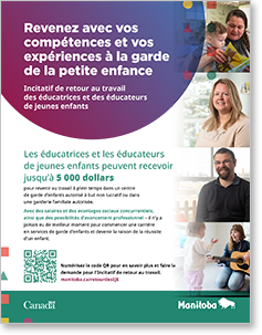 L’Incitatif de retour au travail des éducatrices et éducateurs de jeunes enfants permet à des EJE admissibles de recevoir une subvention de 5 000 $ lorsqu’elles ou qu’ils reviennent travailler à temps plein dans un centre autorisé et sans but lucratif d’apprentissage et de garde de jeunes enfants ou une garderie à domicile autorisée du Manitoba.
