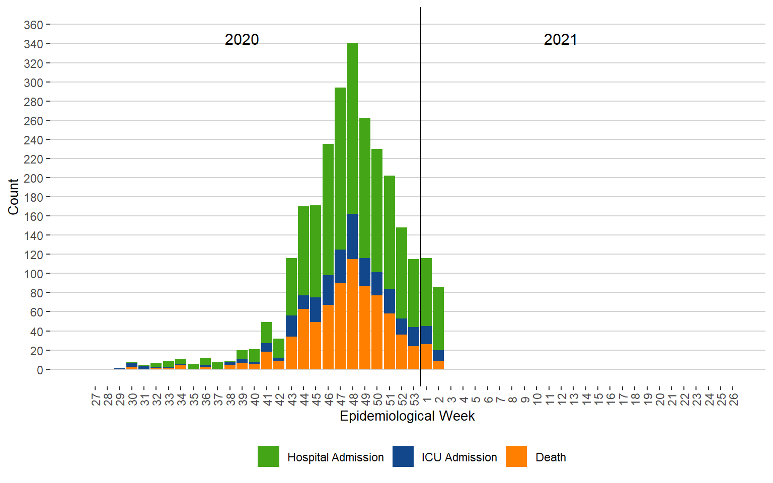 Figure 5. Severe Outcomes of COVID-19 by Week of Public Health Report Date, Manitoba, 2020 – 2021