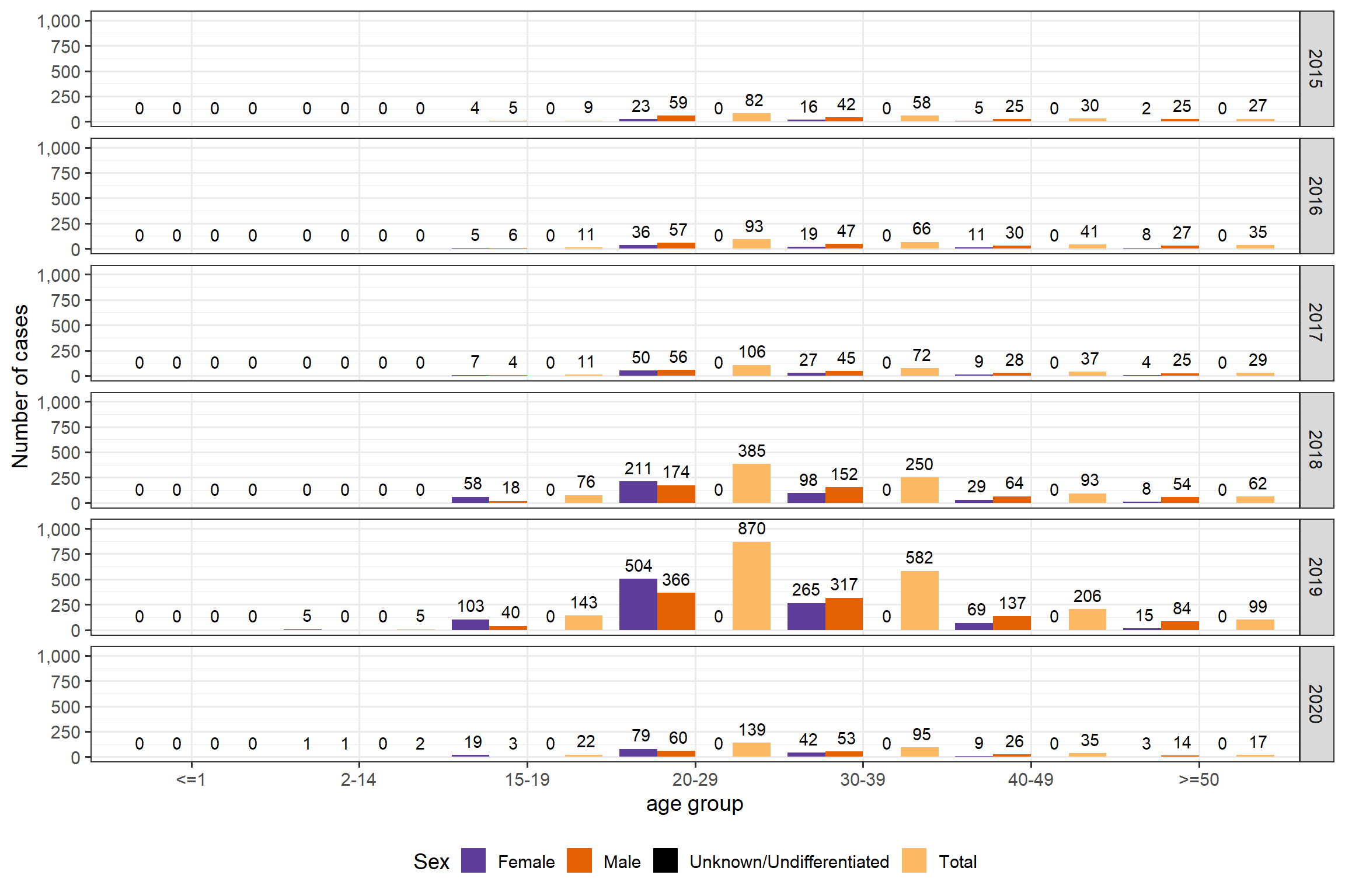 NOTE: Infectious syphilis counts are affected by timely reporting and data entry. These delays, associated with high volume of cases due to outbreaks, may appear as an artificial and sudden drop in number of cases presented here for recent months. This fact is completed unrelated to how treatment is administered. Delays in updating surveillance systems are completely independent of client care, which is always a priority.