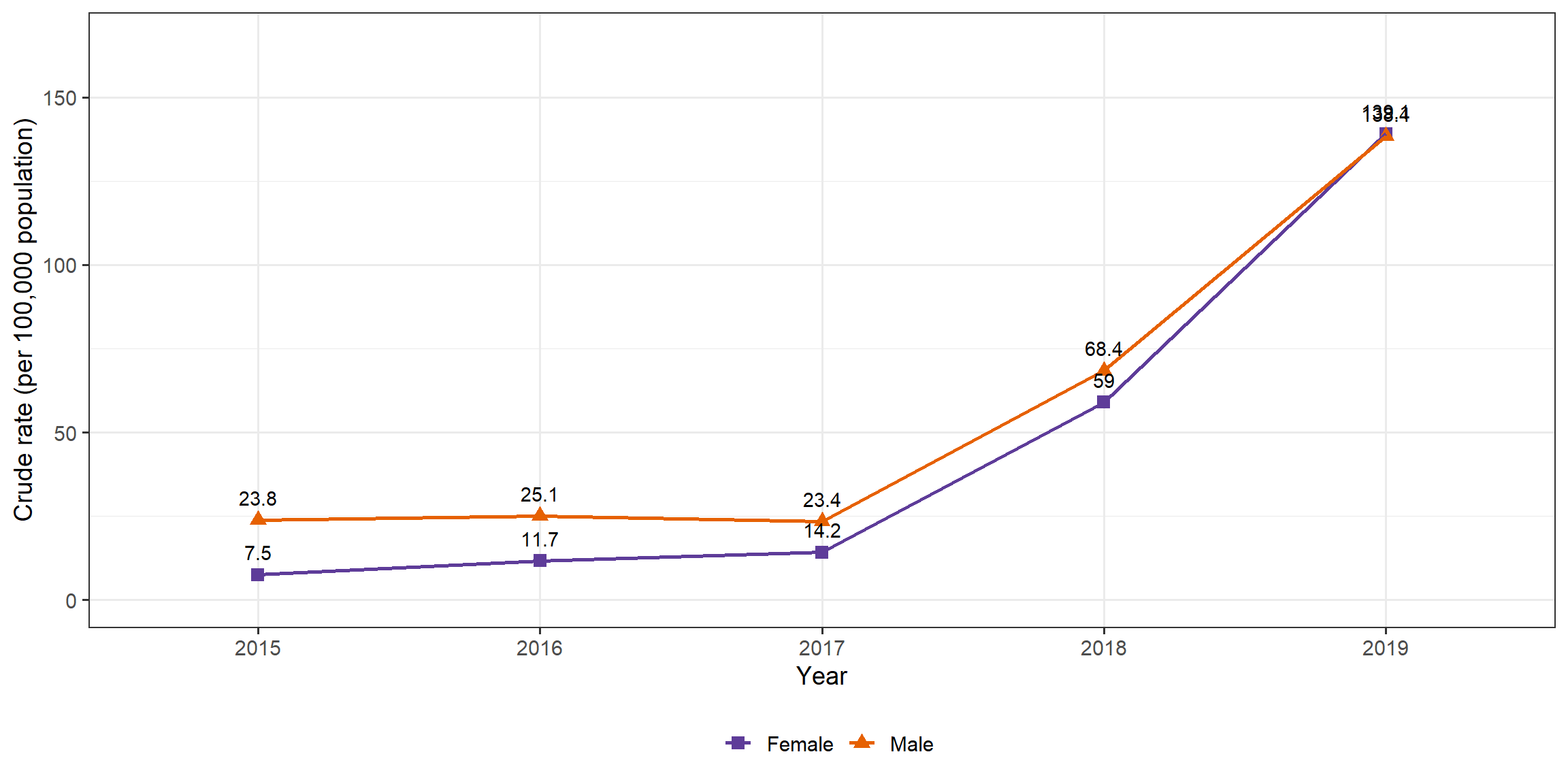 Crude rates of confirmed cases of Infectious Syphilis infections in Manitoba per 100,000 Manitobans per year and by sex, January 01, 2015 to December 31, 2019.