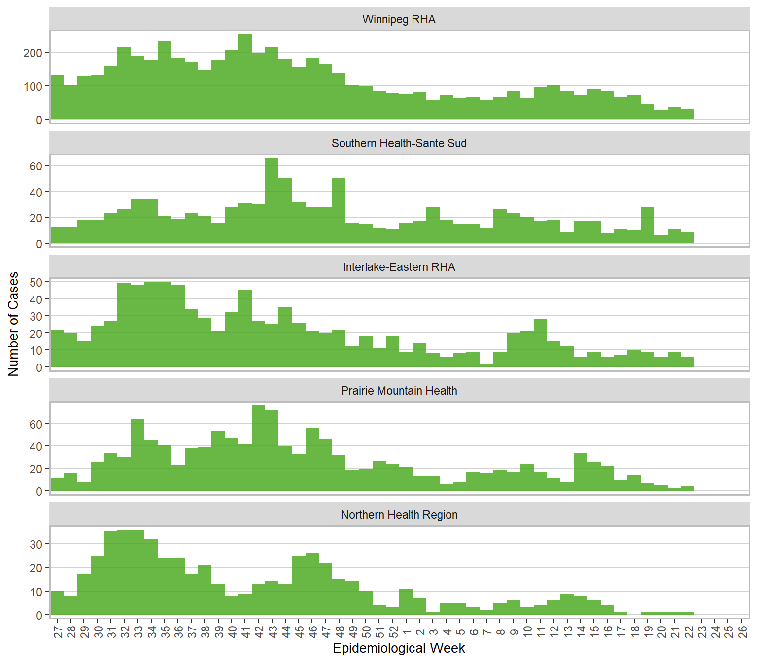 Figure 4. Cases of COVID-19 by Health Region and Public Health Report Date, Manitoba, July 3, 2022 – June 3, 2023