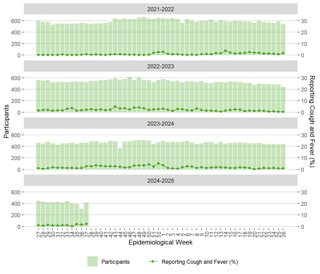 Figure 9. Weekly FluWatchers Participants and Percentage Reporting Fever and Cough, Manitoba, 2020 – September 14, 2024