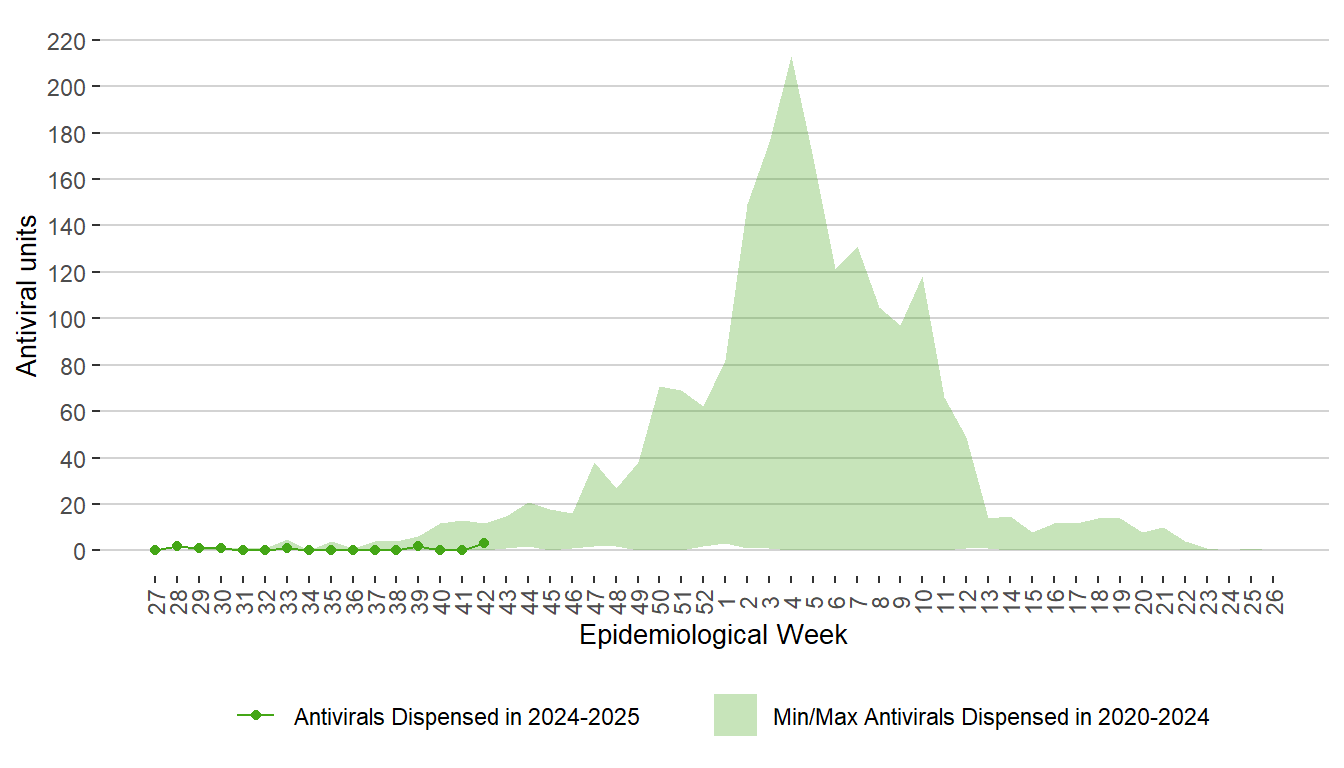 Figure 11. Weekly Units of Antiviral Dispensed from Pharmacies, Manitoba, 2020 – October 19, 2024
