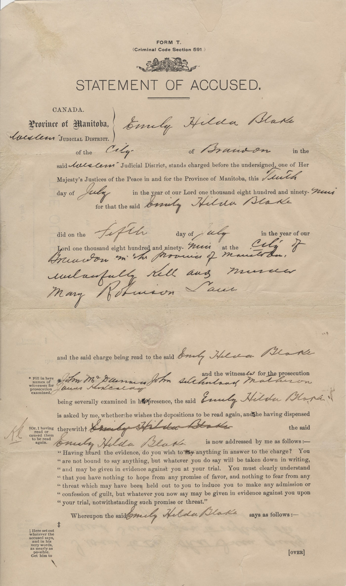 Déclaration de l'accusée dans l'affaire du meurtre commis par Emily Hilda Blake, page 1.